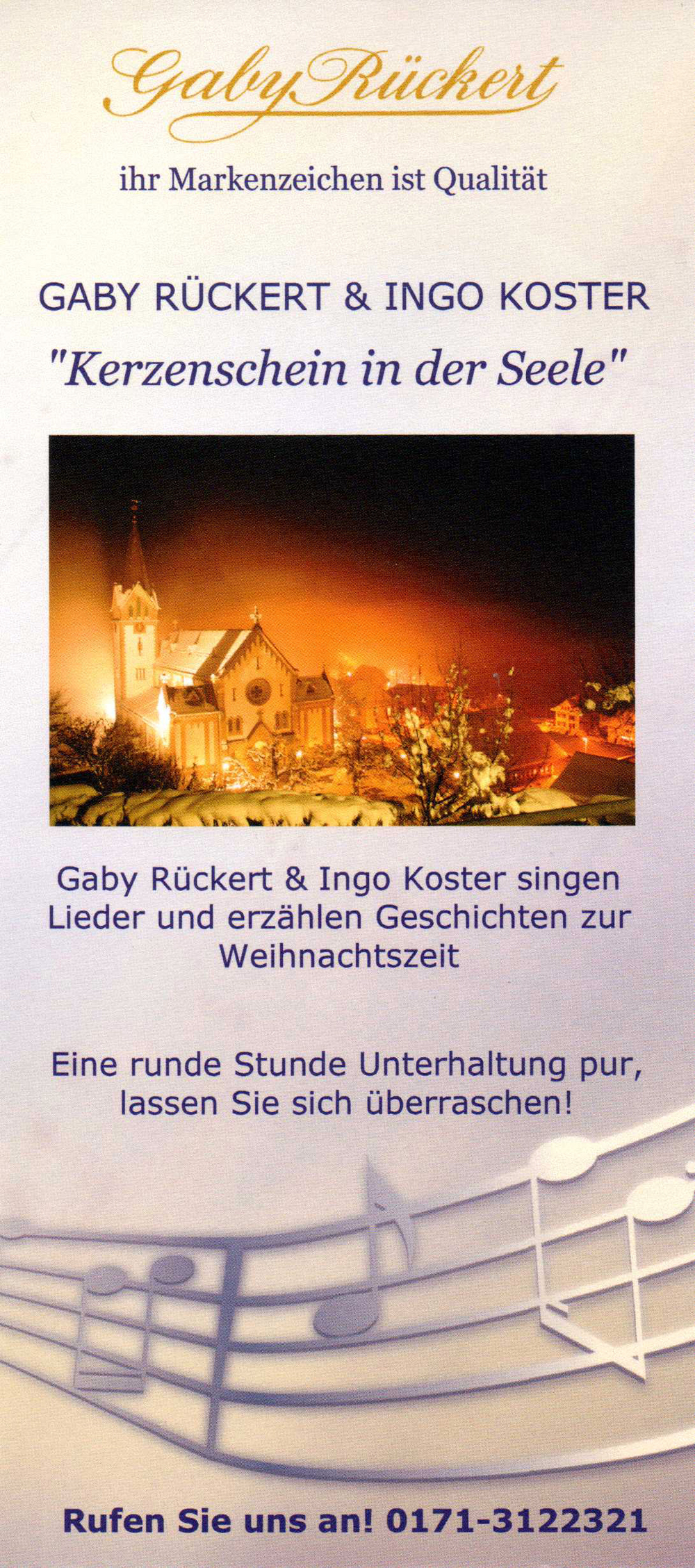 Lieder und Geschichten zur Weihnachtszeit Gaby Rückert und Ingo Koster laden mit traditionellen und eigenen Weihnachtsliedern von ihrem Album "Weihnachtszeit" zum Mitsingen ein, aber auch einige ihrer großen Hits werden wieder einmal erklingen, Klaus Feldmann liest Gedichte und Geschichten zur Weihnachtszeit. Ein besinnlich, nachdenkliches, vorweihnachtliches Programm zum Einstimmen auf das Weihnachtsfest.
